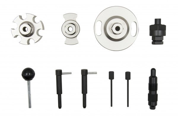 Набор приспособлений для регулировки фаз ГРМ двигателей VAG 2.7/3.0 Tdi, 4.0 Tdi Jonnesway AL010193 применяется для установки и регулировки фаз ГРМ дизельных двигателей объемом 2.7 л и 3.0 л, устанавливаемых на современные автомобили группы VAG, VW Touareg и Audi A8 с двигателем 4.0 TDi ASE.