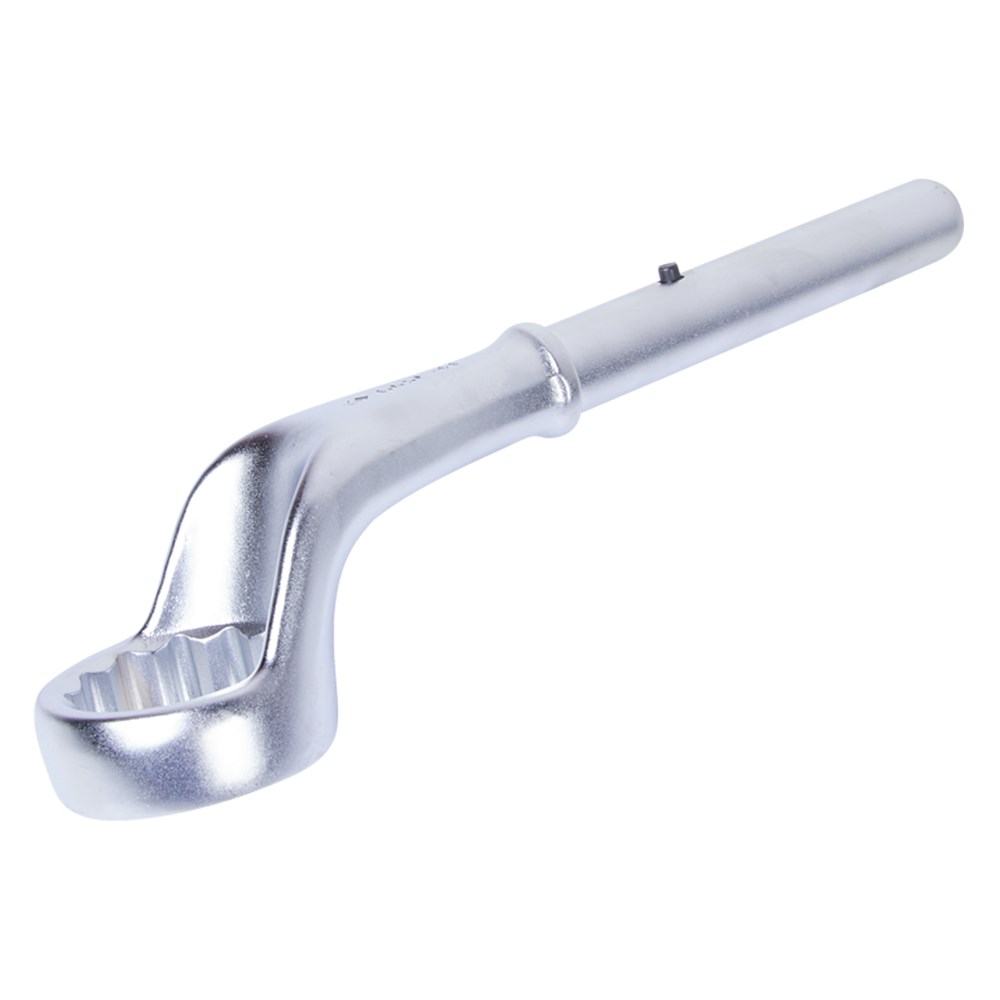 Назначение: Работа с крепежом конструкций и техникой промышленного масштаба. Область применения: Ремонт и обслуживание крупногабаритной техники и конструкций, промышленность, сельское хозяйство, производство, строительство, станции технического обслуживания автомобильной и другой техники. • Использовать ключ в тяжелых условиях под действием больших нагрузок. Особенности: • Для использования совместно с рычагом-трубой арт. 112261 • Накидной профиль прямого действия: работа в местах, где другие форматы ключей не подходят. • Специальный изгиб ключа позволяет работать в местах с ограниченным доступом к крепежу. • 12-тигранный профиль накидной части универсален в работе с головками болтов или гайками как 6- ти, так и 12-тигранного профиля. Качество: Ключи изготовлены из инструментальной легированной хром-ванадиевой стали специального сплава, состоящего из 15 элементов, входящих в его состав. Технология изготовления ключей включает в себя метод горячей ковки с последующей термообработкой,Характеристики