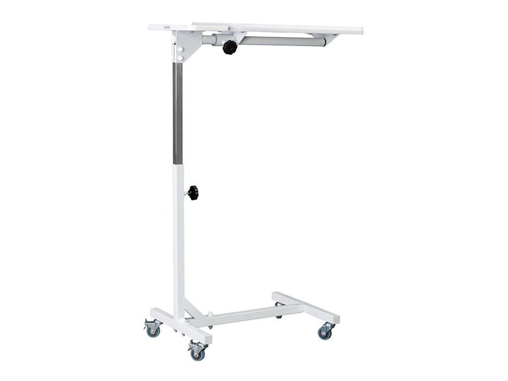 - Гибкость: механическая регулировка высоты и поворотной столешницы с фиксацией позволяет адаптировать стол под нужды пациента; четыре колеса с двумя стопорами обеспечивают легкое перемещение и фиксацию позиции.
