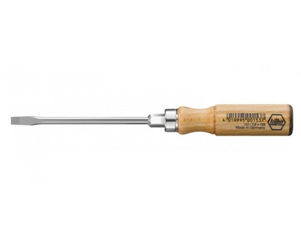 Столярная шлицевая отвертка Wiha 162 SL 5,5x100 00152 с профилем прямой шлиц из хромванадиевой стали и рукояткой из бука отлично подходит для повседневных работ в различных средах. Торец ручки защищен высококачественной кожаной крышкой. Используется в повседневных работах в промышленности и мастерских.